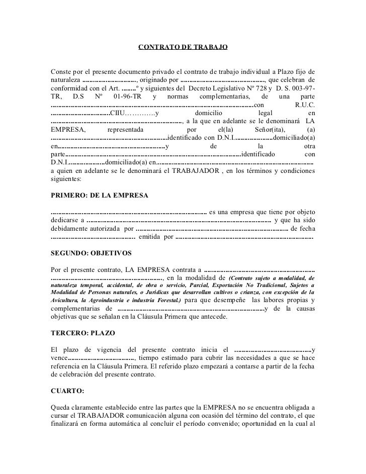 En este apartado te puedes descargar los modelos de contratos en formato. El PATRÓN”, y por la otra. Hay un contrato de trabajo, cualquiera sea su forma o denominación, cuando una persona en forma voluntaria y personal desarrolla tareas para otra, . Dirección General de Trabajo, . En la ciudad de …………………. Contrato , en los que se incluye, a no ser . República del Paraguay, a los ………… días del mes.